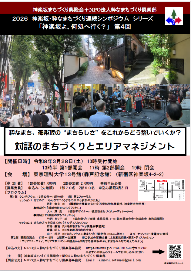 | 2026年3月28日 | (土) | 13:30~19:00 | 募集中 | 神楽坂・粋なまちづくり連続シンポジウム 「神楽坂よ、何処へ行く?」第4回(2026/3/28)![]() | イベント |