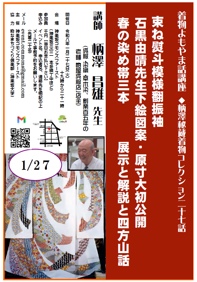 | 2026年1月27日 | (火) | 19:00~21:00 | 【お知らせ】 募集中 | 【お知らせ】神楽坂コモンズファースト講座 着物・染め物よもやま話「柄澤昌雄コレクション第27話」(2026/1/27)![]() | イベント |