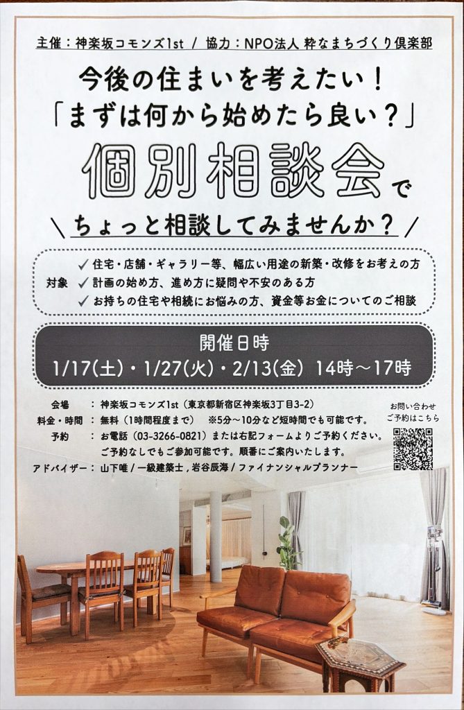こうした状況に対応するため、神楽坂コモンズと粋なまちづくり倶楽部では、まちづくり活動の一環として、住まいや建物などに関するちょっとしたお悩みやご相談事にのってもらえる専門家と連携して、毎月、まちなかでの相談の場を持つこととしました。